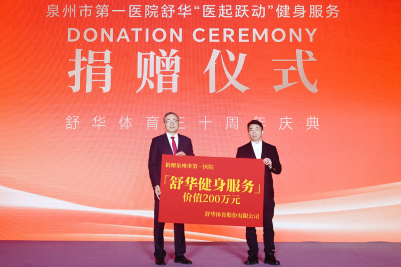慶典伊始,舒華分別向泉州臺商慈善總會、晉江市慈善總會各捐贈1000萬元,用于支持本地醫(yī)療、教育、扶貧等慈善事業(yè);同時向福建醫(yī)科大學附屬第二醫(yī)院、泉州市第一醫(yī)院共捐贈價值400萬元健身服務,為守護人民健康的一線醫(yī)護人員提供專業(yè)的健身支持,致敬他們的辛勤付出。此次捐贈總額高達2400萬元,這不僅是舒華三十周年的一份厚重獻禮,更是企業(yè)扎根社會、回饋社會的堅定承諾。