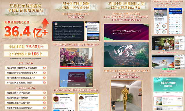 在媒體評(píng)價(jià)與行業(yè)認(rèn)可方面,節(jié)目獲得了國(guó)內(nèi)外多家媒體的一致關(guān)注?!度嗣袢?qǐng)?bào)》《參考消息》等中央媒體在焦點(diǎn)版面進(jìn)行報(bào)道;美聯(lián)社、路透社等世界級(jí)通訊社發(fā)布專(zhuān)項(xiàng)報(bào)道,相關(guān)報(bào)道觸達(dá)人次超10億+,有效引領(lǐng)了海外中醫(yī)藥學(xué)習(xí)與討論的熱潮。