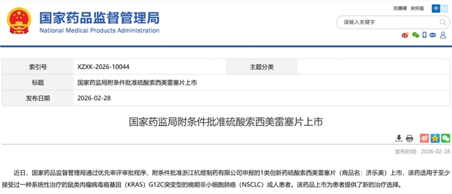 2月28日,國家藥品監(jiān)督管理局發(fā)布公告,上海濟(jì)煜醫(yī)藥科技股份有限公司自主研發(fā)的 1 類抗腫瘤創(chuàng)新藥濟(jì)樂美@(硫酸索西美雷塞片)獲批上市,主要用于治療至少接受過一種系統(tǒng)性治療的鼠類肉瘤病毒癌基因KRAS G12C突變型的晚期非小細(xì)胞肺癌(NSCLC)成人患者,為晚期非小細(xì)胞肺癌患者帶來治療新選擇。