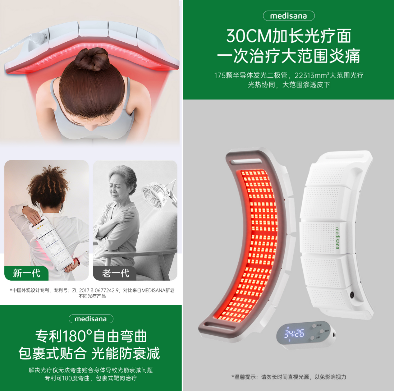 針對(duì)職場(chǎng)女性久坐勞損、肌肉酸痛、炎癥腫脹、皮膚痤瘡等高頻不適,契合女性悅己消費(fèi)中“輕養(yǎng)生、隨時(shí)護(hù)”的需求,medisana馬德保康德國(guó)紅藍(lán)光理療儀以穿戴式大面積光療,實(shí)現(xiàn)全身多部位舒緩修護(hù)。