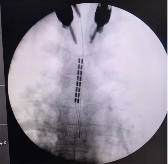 經(jīng)過(guò)嚴(yán)格的術(shù)前討論,團(tuán)隊(duì)決定為孫女士施行頸段脊髓電刺激(SCS)植入術(shù)。手術(shù)由陳菊祥教授主刀,在C臂X光機(jī)精準(zhǔn)引導(dǎo)下,將刺激電極植入頸髓(C2-C4水平)硬膜外腔的中線位置。
