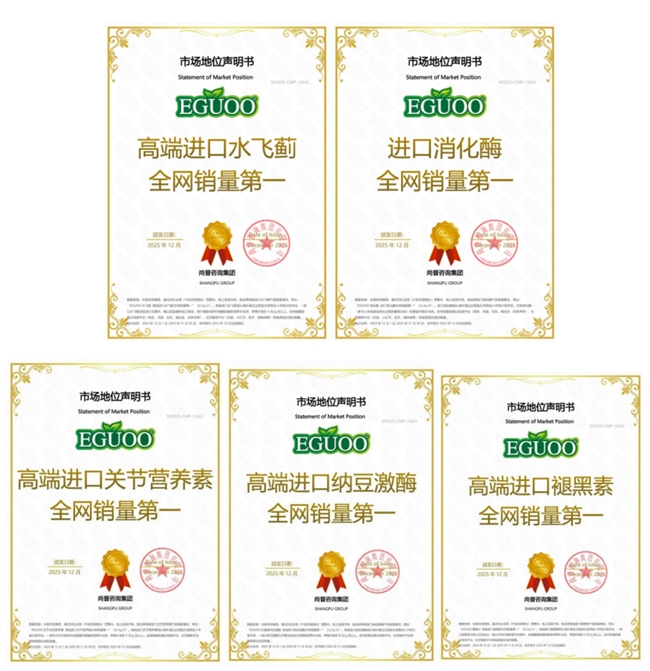 憑借卓越的研發(fā)實(shí)力與產(chǎn)品品質(zhì),EGUOO在全球健康營養(yǎng)領(lǐng)域不斷獲得權(quán)威認(rèn)可,榮獲了2025年度TITAN健康金獎(jiǎng),成功躋身天貓國際2025億元俱樂部,并獲得知名咨詢機(jī)構(gòu)尚普咨詢“進(jìn)口消化酶全網(wǎng)銷量第一”“高端進(jìn)口水飛薊全網(wǎng)銷量第一”“高端進(jìn)口關(guān)節(jié)營養(yǎng)素全網(wǎng)銷量第一”“高端進(jìn)口納豆激酶全網(wǎng)銷量第一”“高端進(jìn)口褪黑素全網(wǎng)銷量第一”等市場認(rèn)證地位。值得一提的是,EGUOO 全線產(chǎn)品通過美國 FDA、USP 等權(quán)威認(rèn)證,以嚴(yán)苛的質(zhì)量標(biāo)準(zhǔn)服務(wù)全球用戶,致力于為全球消費(fèi)者提供高品質(zhì)的精準(zhǔn)營養(yǎng)健康產(chǎn)品。