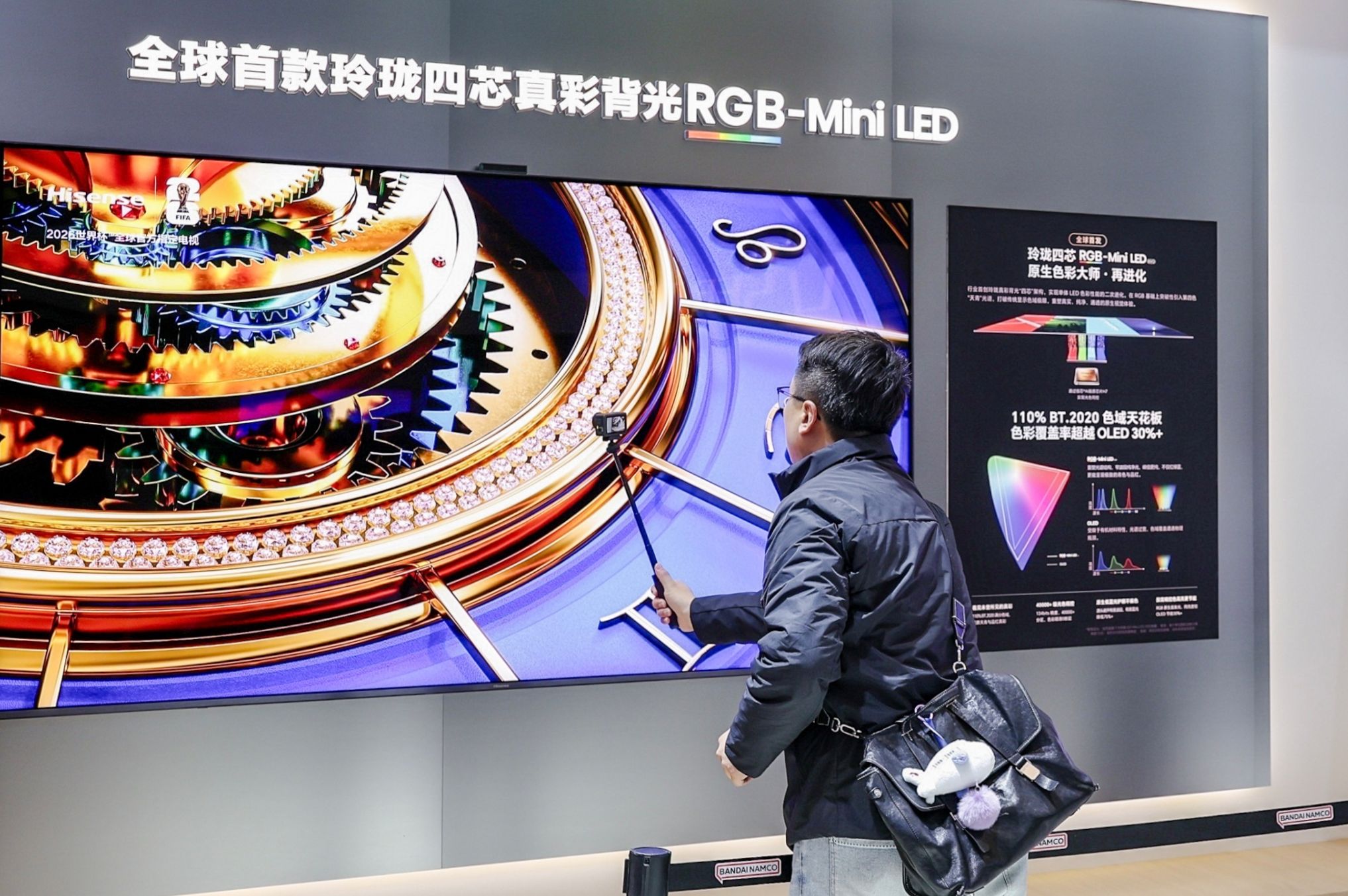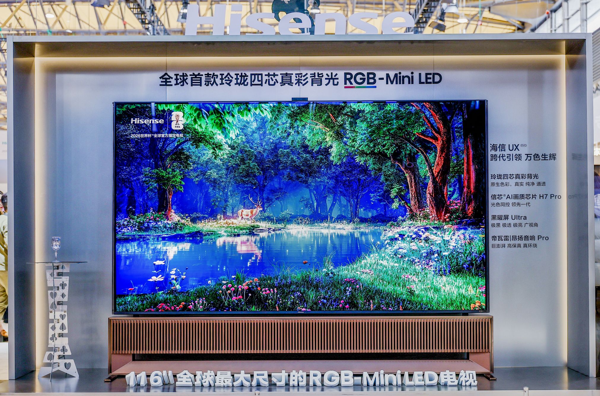 特別是116UX2026款,作為全球最大的 RGB-Mini LED 電視,帶來了“犯規(guī)級(jí)”的畫質(zhì)暴擊。春日花海的層次漸變、海底珊瑚的斑斕肌理、非遺掐絲琺瑯的溫潤(rùn)質(zhì)感,逼真到仿佛身臨其境。影游旗艦E8S Pro則現(xiàn)場(chǎng)打造了沉浸式體驗(yàn)區(qū),體驗(yàn)者可以秒切專屬《黑神話》《影之刃零》游戲模式,搭配4K 180Hz原生高刷與FreeSync Premium PRO技術(shù),運(yùn)行游戲無拖影、無撕裂,操作直接起飛。世界杯觀賽區(qū)則是體育迷的“樂土”,百吋大屏除了帶來如臨現(xiàn)場(chǎng)的沉浸感,其內(nèi)置AI體育智能體,可實(shí)時(shí)識(shí)別球星、拆解戰(zhàn)術(shù)等,是最好的“看球搭子”。