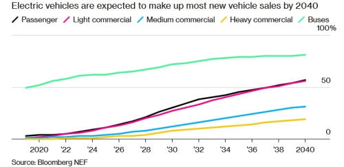 到2040年,電動汽車預(yù)計將占新車銷售的大部分。