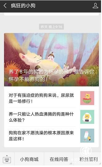 據(jù)了解,瘋狂小狗以天貓、京東等綜合電商平臺(tái)為主要陣地,借助公眾號(hào)、訂閱號(hào)、小程序、APP、CRM系統(tǒng),構(gòu)建瘋狂小狗線上用戶矩陣,實(shí)現(xiàn)與用戶的親密、頻繁的互動(dòng),在增強(qiáng)品牌黏性的同時(shí),也從根本上了解用戶需求,進(jìn)而在用戶反饋基礎(chǔ)上,對(duì)銷售、產(chǎn)品等進(jìn)行調(diào)整,從而為消費(fèi)者打造貼心、愉快的購物體驗(yàn)。以瘋狂小狗微信公眾號(hào)為例,其面向C端養(yǎng)狗人群,內(nèi)容以情感生活和科普知識(shí)為主,頻頻與用戶互動(dòng),看點(diǎn)多多,成為品牌吸睛的一大利器。