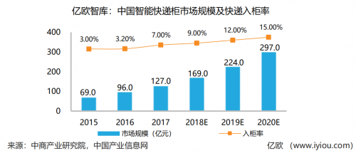 圖:億歐智庫(kù)數(shù)據(jù)顯示,中國(guó)智能快遞柜市場(chǎng)規(guī)模及入柜率逐年增加