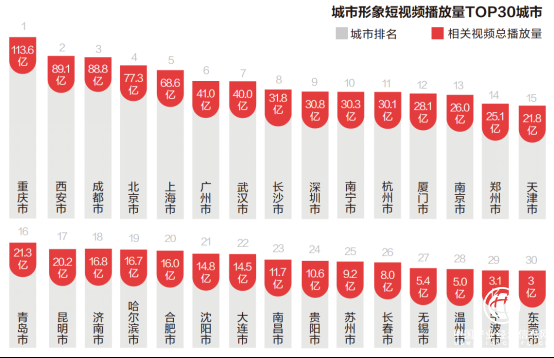 從城市形象相關(guān)視頻的播放量上來看,“新一線”城市在抖音上集體崛起。重慶是唯一一個(gè)播放量過百億級(jí)的城市,城市形象相關(guān)視頻的總播放量達(dá)113.6億,可稱得上是“抖音之城”。