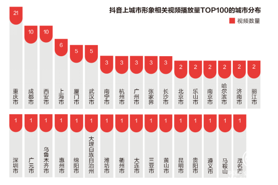熱門視頻數(shù)量上,“西部三城”的表現(xiàn)同樣搶眼,城市形象熱門視頻TOP100榜單中,僅重慶就有21條視頻上榜,數(shù)量遙遙領(lǐng)先其他城市,而成都與西安也各有10條視頻入榜。這些展現(xiàn)西部三城形象的短視頻,在榜單中占比約4成。
