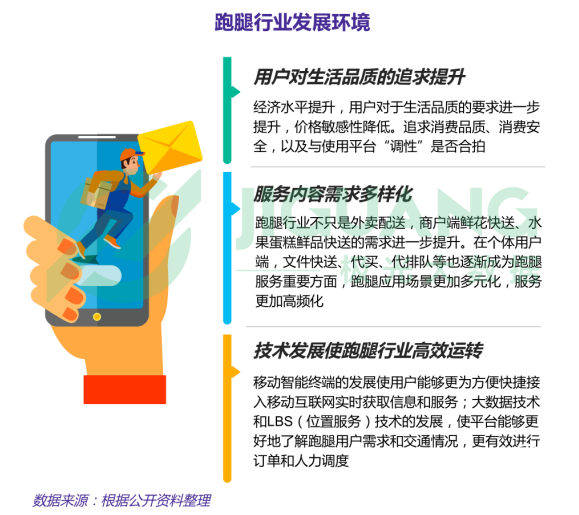 用戶需求是根本,技術(shù)進(jìn)步是“加速器”,個(gè)體對價(jià)格敏感性降低,追求消費(fèi)品質(zhì)推動(dòng)了跑腿行業(yè)的興起與發(fā)展,外賣、鮮花、商超零售等多領(lǐng)域的快速發(fā)展也使跑腿行業(yè)服務(wù)內(nèi)容愈加豐富,大數(shù)據(jù)和LBS技術(shù)發(fā)展推動(dòng)跑腿行業(yè)更加快速高效發(fā)展。