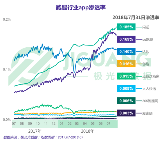 過去一年各跑腿行業(yè)主要app均呈現(xiàn)明顯上升趨勢,截至2018年7月底,閃送app以0.185%滲透率居于首位,uu跑腿以0.169%滲透率緊隨其后;閃送、uu跑腿和達(dá)達(dá)滲透率均在0.1%以上,暫時(shí)位于第一梯隊(duì)。