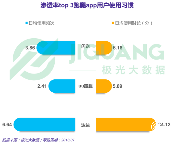 或因與外賣商家客戶聯(lián)系較為緊密,達(dá)達(dá)日均使用頻次和使用時(shí)長優(yōu)勢突出,日均使用頻次為6.64次,日均使用時(shí)長達(dá)34.12分。
