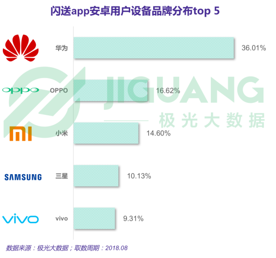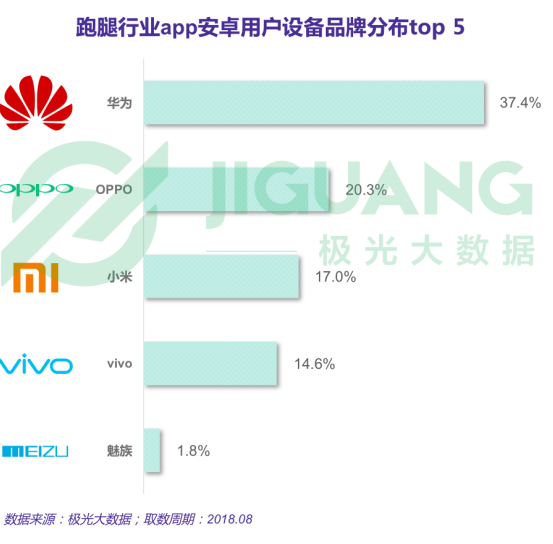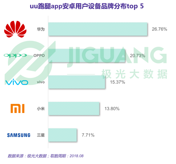 根據(jù)極光大數(shù)據(jù)統(tǒng)計(jì),uu跑腿app安卓用戶中,約1/4使用華為品牌旗下設(shè)備,約1/5使用OPPO旗下產(chǎn)品。