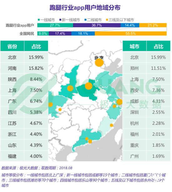 在地域分布方面,uu跑腿app用戶半數(shù)為新一線城市用戶;或因uu跑腿成立于河南,在河南及周邊的陜西發(fā)展較為成熟,超五成用戶來自此兩個(gè)省份。