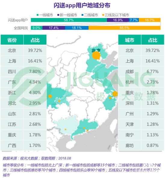 在地域分布方面,閃送app用戶主要集中在沿海省份和城市,此外在四川、重慶也有較多用戶。