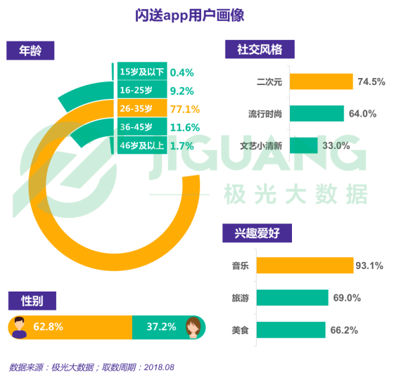 閃送app用戶年齡分布非常集中,以26-35歲為主,男性用戶占比超六成。
