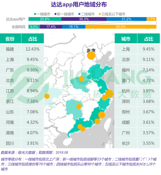 達(dá)達(dá)app用戶超九成集中在二線及以上城市,主要分布在東部和東南沿海省份和城市,近一成為上海用戶。