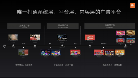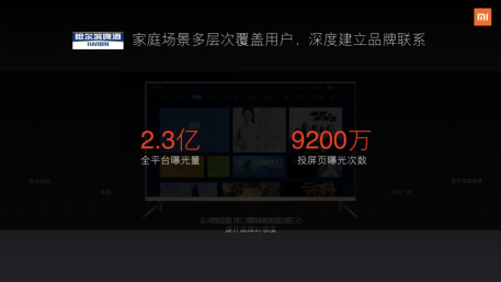 小米營(yíng)銷通過不斷深挖和創(chuàng)新,持續(xù)賦能這一媒介。為電視這一媒介帶入互動(dòng)基因,成為品牌與消費(fèi)者溝通的場(chǎng)所。作為唯一打通系統(tǒng)層、平臺(tái)層、內(nèi)容層的廣告品牌,從開機(jī)廣告、高清畫報(bào)等強(qiáng)曝光形式,到平臺(tái)層桌面、PatchWall、頻道的寬廣渠道,再到內(nèi)容層定制劇場(chǎng)、定制頻道的高交互資源,在媒介深度上挖掘觸點(diǎn),幫助品牌與用戶持續(xù)溝通從而講完整個(gè)故事。