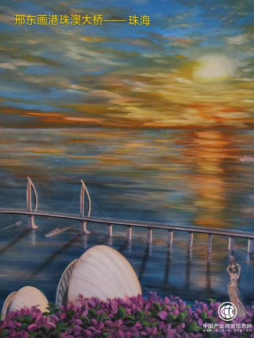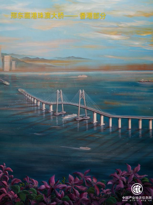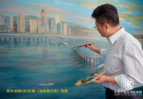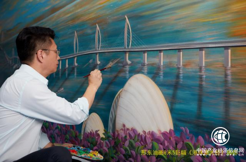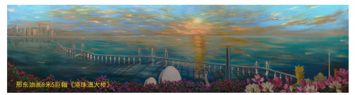 邢東創(chuàng)作繪畫的巨幅油畫《蛟龍出海——港珠澳大橋》將開始巡回展出。該油畫長達(dá)8.5米,高達(dá)2.25米,邢東歷時三個月,用激情澎湃的筆觸完成了這幅史詩級油畫巨作。在這幅油畫中,闊大的伶仃洋海面上,港珠澳大橋像一條出海的蛟龍,迎著金色的朝陽蜿蜒逶迤,將香港、珠海和澳門連接在一起,一群海鷗向著冉冉升起的朝陽飛去,被彩霞映照的海面上,各種游輪、貨船繁忙地穿梭,整幅畫面氣勢恢宏,輝煌燦爛!
