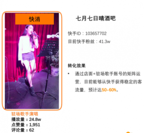 商家在進(jìn)行短視頻營(yíng)銷時(shí)應(yīng)充分考慮場(chǎng)景這一核心要素, 以達(dá)到更好的傳播效果。在快手平臺(tái)獲得的關(guān)注度能夠高效地在相應(yīng)實(shí)體店面變現(xiàn)。同時(shí)快手平臺(tái)人工智能技術(shù)實(shí)現(xiàn)精準(zhǔn)匹配推送至需要的人群,形成了資源的高效匹配。例如酒吧駐唱歌手通過在快手平臺(tái)發(fā)布演唱視頻的方式積累的人氣能夠轉(zhuǎn)化為真實(shí)客流。