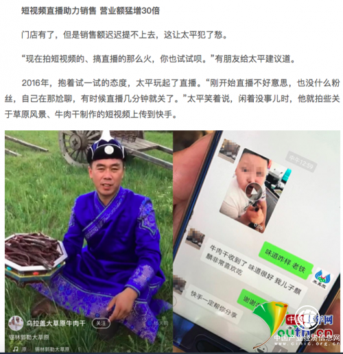 錫林郭勒盟烏拉蓋草原的蒙古族漢子太平,通過在快手記錄自家制作牛肉干的過程,吸引了眾多快手老鐵的關(guān)注,逐步打開了市場(chǎng),擴(kuò)大了生產(chǎn)規(guī)模,并帶動(dòng)當(dāng)?shù)刎毨裘撠氈赂弧?/p>