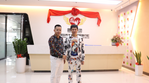 圖注:圓夢集團董事長曾亞勇先生與國際功夫巨星(著名導(dǎo)演)陳天星在新成立的圓夢集團國際旅行社千握手留影