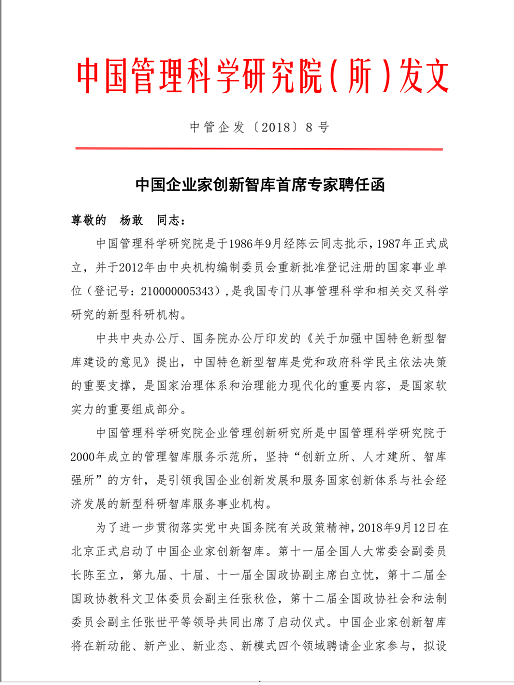 11月8日,管理學(xué)博士、美國(guó)加州州立大學(xué)經(jīng)濟(jì)學(xué)博士后、高級(jí)經(jīng)濟(jì)師、省委決策咨詢專家、貴州省科協(xié)常委、貴州大學(xué)高層管理者培訓(xùn)與發(fā)展中心顧問(wèn)、貴州財(cái)經(jīng)大學(xué)兼職教授、碩士生導(dǎo)師、貴州省作家協(xié)會(huì)理事、貴州省國(guó)際國(guó)內(nèi)公共關(guān)系協(xié)會(huì)常務(wù)副會(huì)長(zhǎng)、貴州省婚姻家庭建設(shè)協(xié)會(huì)會(huì)長(zhǎng)、貴州省全民素質(zhì)工作委員會(huì)主任委員、中國(guó)互聯(lián)網(wǎng)協(xié)會(huì)政務(wù)創(chuàng)新工作組專家、世界城市智慧工程技術(shù)(北京)研究院常務(wù)理事長(zhǎng)、貴州省財(cái)經(jīng)企業(yè)聯(lián)合會(huì)主席、貴州貴商集團(tuán)董事長(zhǎng)、貴州智慧產(chǎn)業(yè)集團(tuán)董事長(zhǎng)楊敢受聘為第十五屆中國(guó)科學(xué)家論壇中國(guó)企業(yè)家創(chuàng)新智庫(kù)首席專家。
