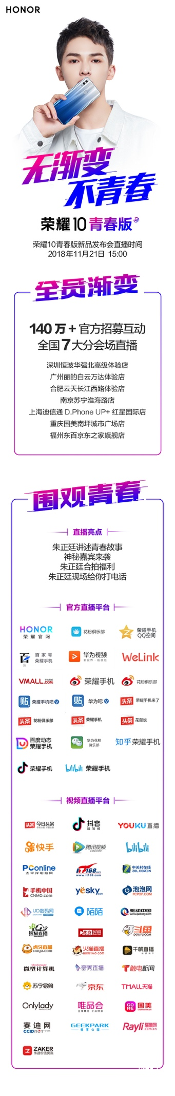 以朱正廷的超高人氣來看,現(xiàn)場的氛圍一定會非常的火爆,榮耀10青春版發(fā)布會恐怕是要一票難求。更何況榮耀10青春版自公布以來,就憑借獨(dú)樹一幟的漸變色和2400萬AI自拍,引來無數(shù)網(wǎng)友的關(guān)注和響應(yīng),相信有很多粉絲也會因此更加期待11月21日的發(fā)布會。據(jù)悉,發(fā)布上還會有神秘嘉賓現(xiàn)身、朱正廷現(xiàn)場打電話等等玩心跳玩刺激的環(huán)節(jié),想想都是期待感炸裂、粉絲福利爆棚呢!珍珠糖們,搬好小板凳坐等明天的直播吧!