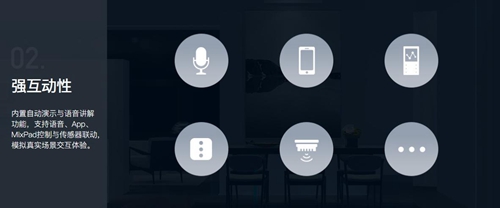 第二大優(yōu)勢(shì)為“強(qiáng)互動(dòng)性”,歐瑞博mini體驗(yàn)廳支持自動(dòng)演示與語(yǔ)音講解,并且語(yǔ)音、智家365 App、MixPad控制與傳感器聯(lián)動(dòng)等常見(jiàn)智能家居操控方式一應(yīng)俱全。值得一提的是MixPad,mini體驗(yàn)廳功能與功能強(qiáng)大的MixPad完美配合,一方面體現(xiàn)了MixPad全面的兼容性,另一方面也體現(xiàn)了mini體驗(yàn)廳對(duì)現(xiàn)實(shí)場(chǎng)景的完美模擬。