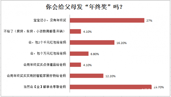 “會(huì)給,但又擔(dān)心他們把錢存著。”很多網(wǎng)友認(rèn)為,直接給紅包最合適, 但有16.7%的用戶選擇用年終獎(jiǎng)買禮物回家送爸媽。