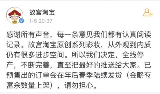 記者注意到,1月5日,故宮淘寶已經(jīng)在官方微博上表示,為不斷完善,其原創(chuàng)系列彩妝決定全線停產(chǎn),已預(yù)售的訂單則會(huì)在年后春季陸續(xù)發(fā)貨。