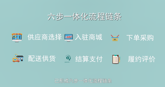 電商化采購業(yè)務流程規(guī)范運轉(zhuǎn)高效,已形成六部一體化流程鏈條,供應商選擇、入住商城、下單采購、配送供貨、結(jié)算支付、履約評價。