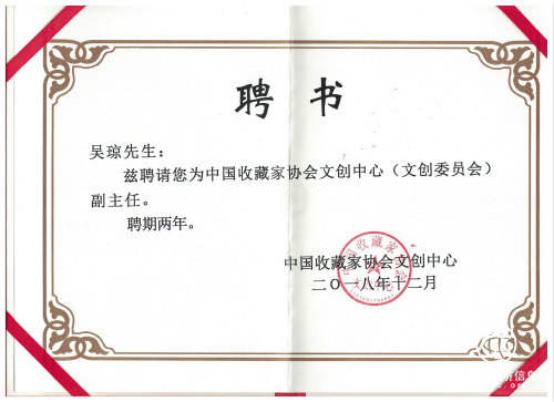2018年12月,中國收藏家協(xié)會現(xiàn)任會長羅伯健先生 授予北京榮盛眾藏文化吳瓊先生為“中國收藏家協(xié)會文創(chuàng)中心副主任”,吳瓊先生也表示,責(zé)任與擔(dān)當(dāng)同行,一定全力促進藝術(shù)品行業(yè)的健康發(fā)展,為社會主義物質(zhì)文明和精神文明建設(shè)作貢獻。