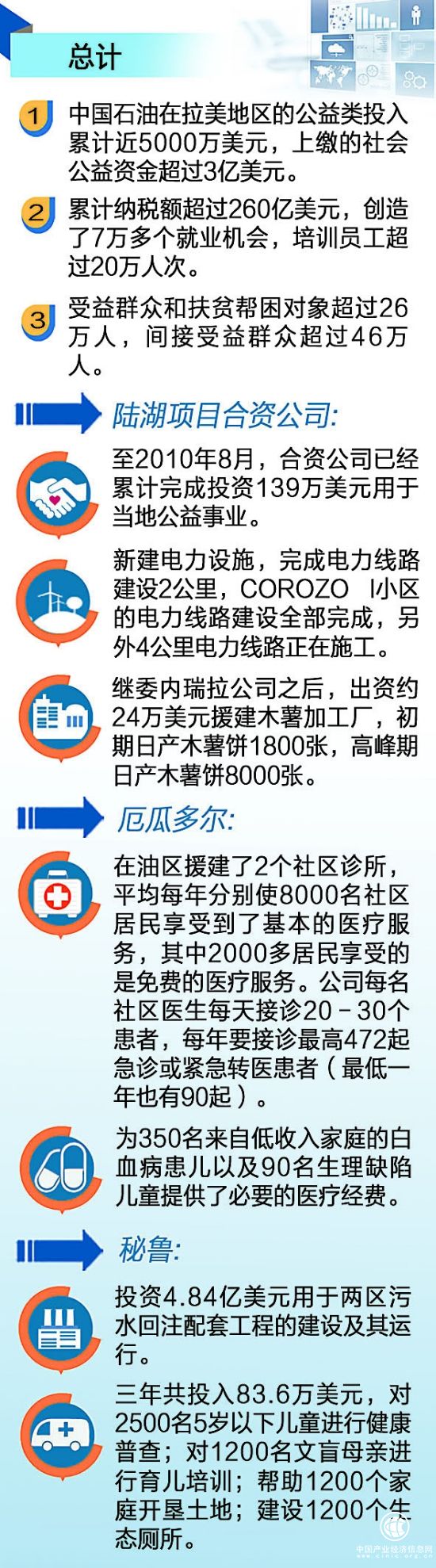 25年來,中國石油在拉美地區(qū)的各類社會公益類項目累計投入近5000萬美元,拉美公司和工程技術服務公司直接投入和間接上繳的社會公益資金超過3億美元,受益群眾和扶貧幫困對象超過26萬人,間接受益群眾超過46萬人,獲得了資源國政府和所在社區(qū)的普遍好評與稱贊,為公司業(yè)務的持續(xù)健康發(fā)展提供了有力的支持和保障。