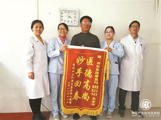 圖為偏癱患者經(jīng)過兩個月的康復(fù)治療,可以生活自理,給商林康復(fù)團(tuán)隊送來錦旗。